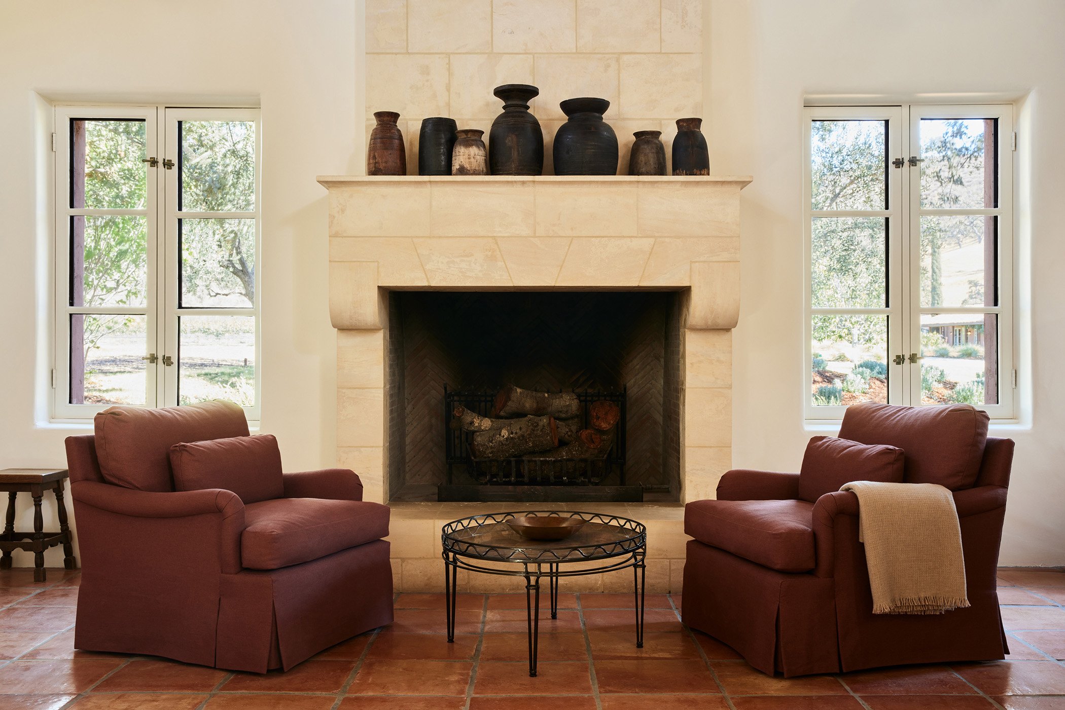 Corinne Mathern Studio pulled hues of the olive trees, vines and hills to the interior through a muted palette of neutrals, sage greens, dusty blues, chocolate browns, deep rusts, tans and creams for a sense of harmony. Corinne Mathern Studio designed the oak millwork throughout the entire property to complement the cedar and Douglas fir ceilings. With simple flat front panels, the millwork brought a modernism to the property that was necessary.